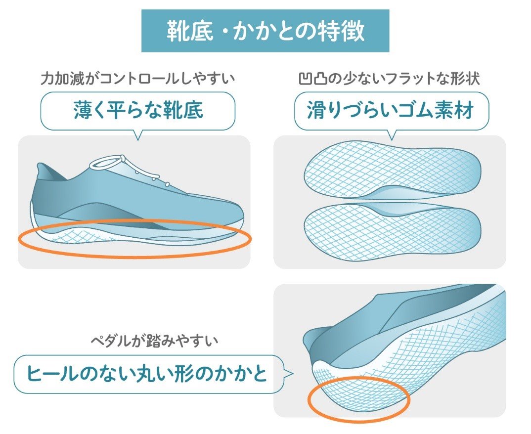 車を運転する時には、かかとを床につけた状態で、ペダルを踏み替えます。かかとが丸くなっていることで支点がしっかりと定まり、ペダルの踏み替えがしやすくなります。